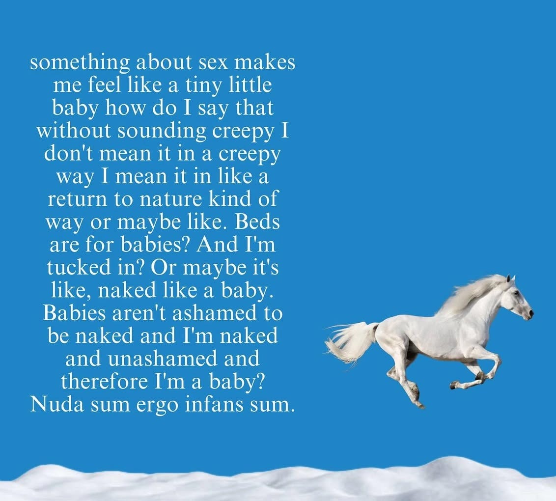 Wearing my pink cashmere sweater holding my rabbit made me feel like a baby in a good way, made me feel loved really well the way a baby needs and wants. I’ve written too about how something about sex makes me feel like a baby, but like, in a normal way. I’ll include the horse post here for you.